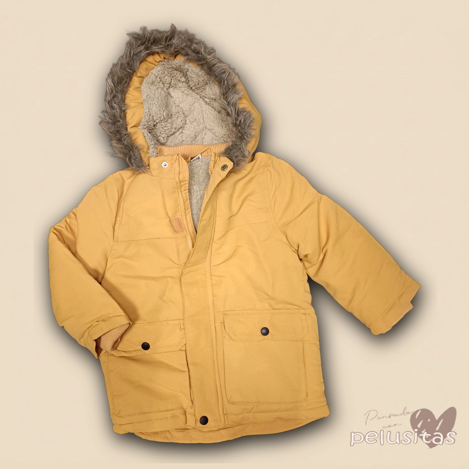 + Free ShippingCampera amarilla con capucha forrada en forro piel, ideal para los días de frío. Super abrigada y cómoda.