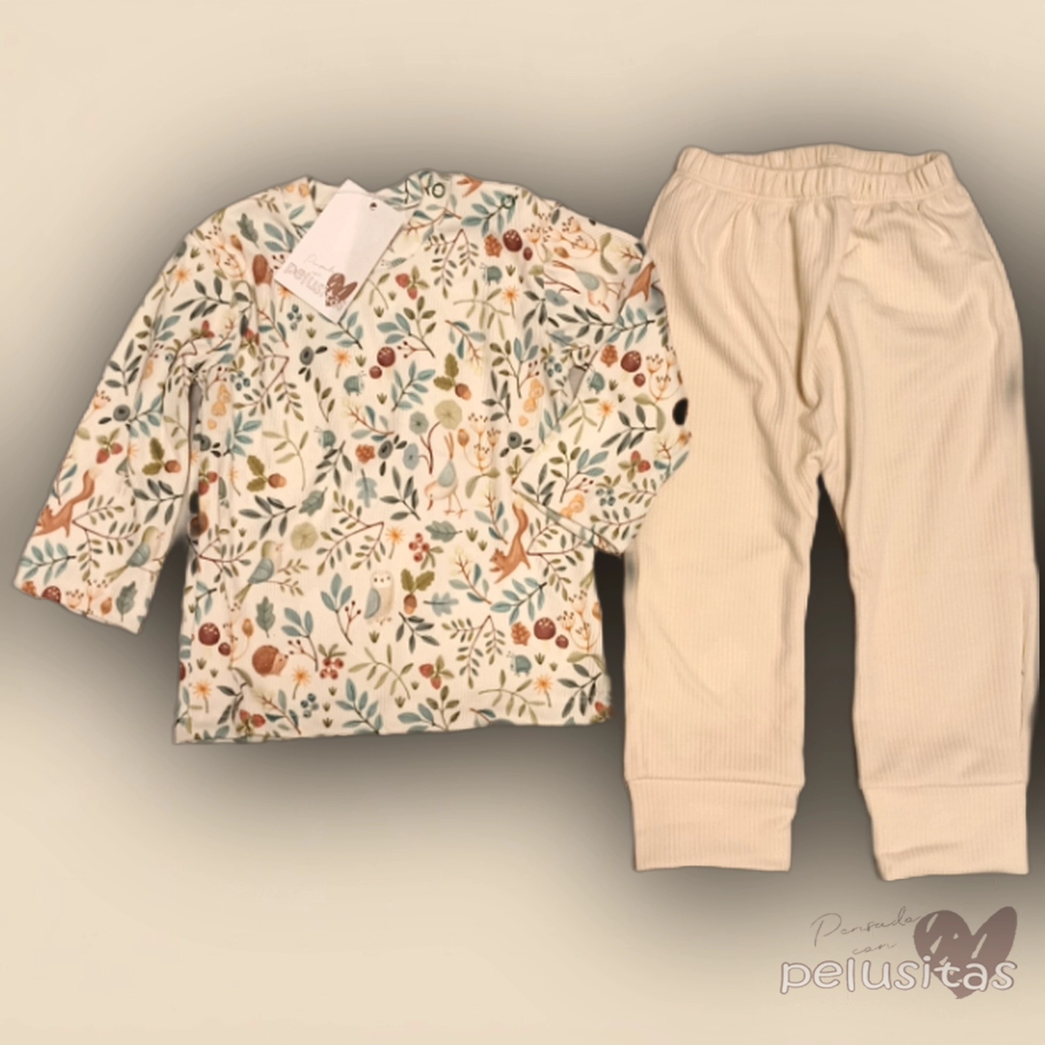 Conjunto compuesto por remera de manga larga con hermoso estampado de flores y hojas en tonos suaves, acompañada de pantalon liso en tono natural. Confeccionado en algodon suave, ideal para el uso diario. Consultanos por talles y disponibilidad via WhatsApp.