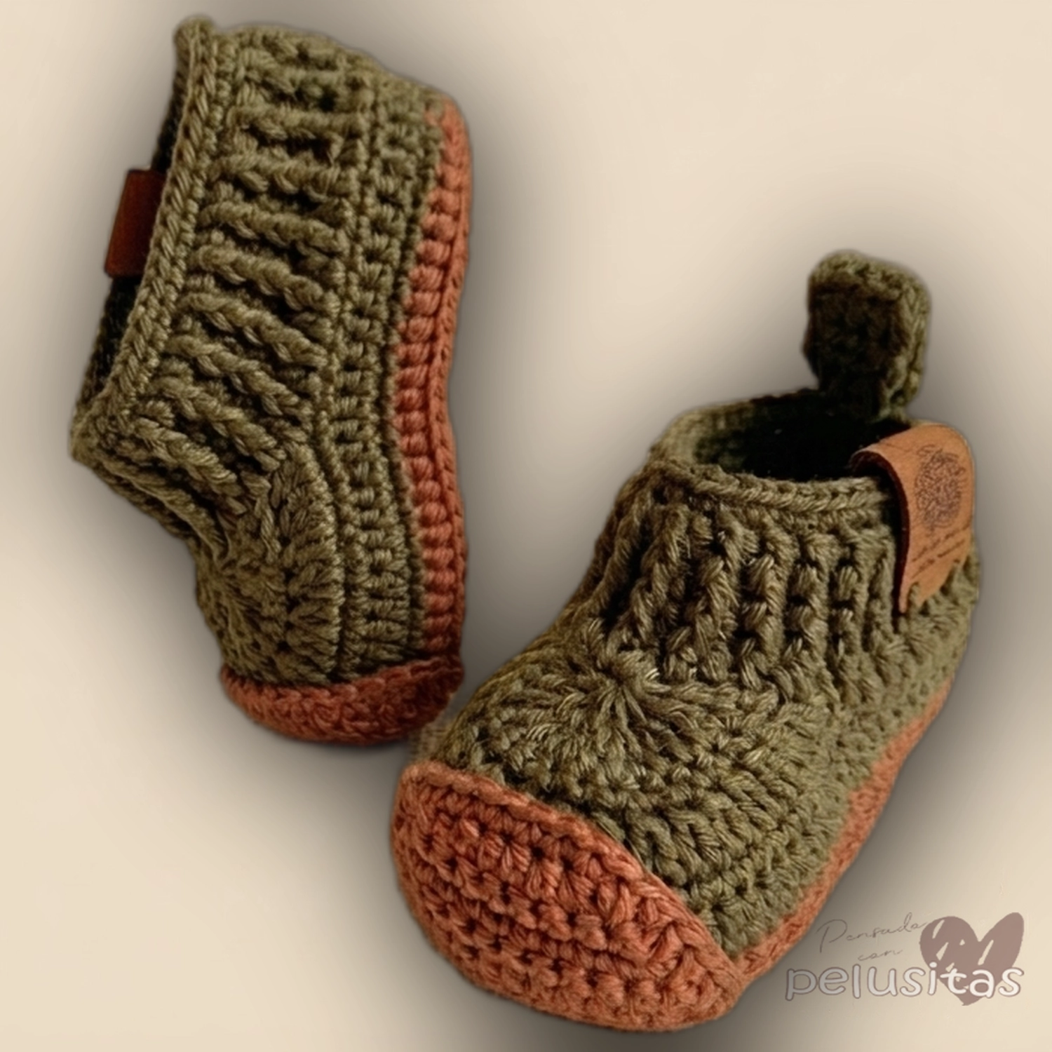 Escarpines tejidas a mano en crochet con hilo verde oliva y detalles en coral. Perfectas para mantener los piecitos abrigados y cómodos. Consultanos por WhatsApp para talles disponibles y más información.
