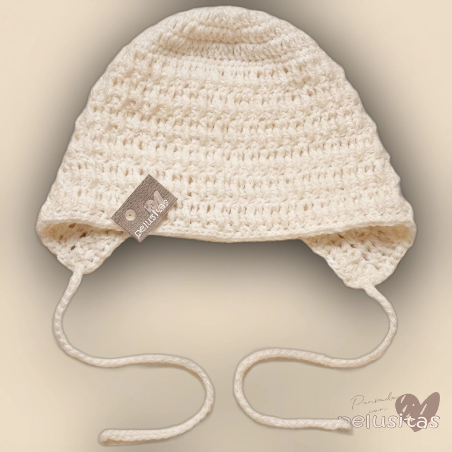 + Free ShippingGorrito tejido a mano en hilo natural con moños laterales y tiritas para atar. Ideal para recien nacidos.