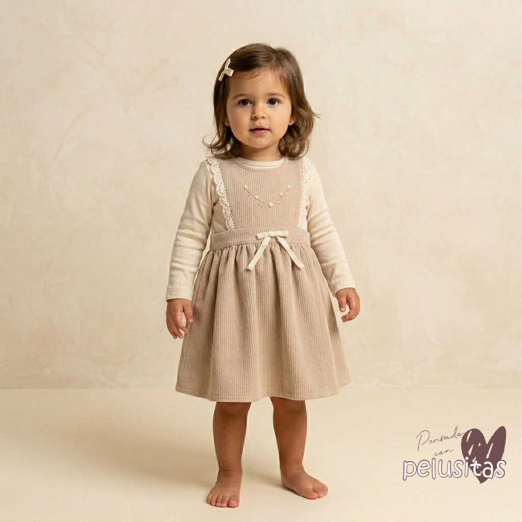 Vestido de pana con tiradores decorativos y volados, más una remera de manga larga a tono. El vestido tiene un lazo al frente y el diseño permite total comodidad para el movimiento. Consultanos por WhatsApp para conocer talles y colores disponibles.